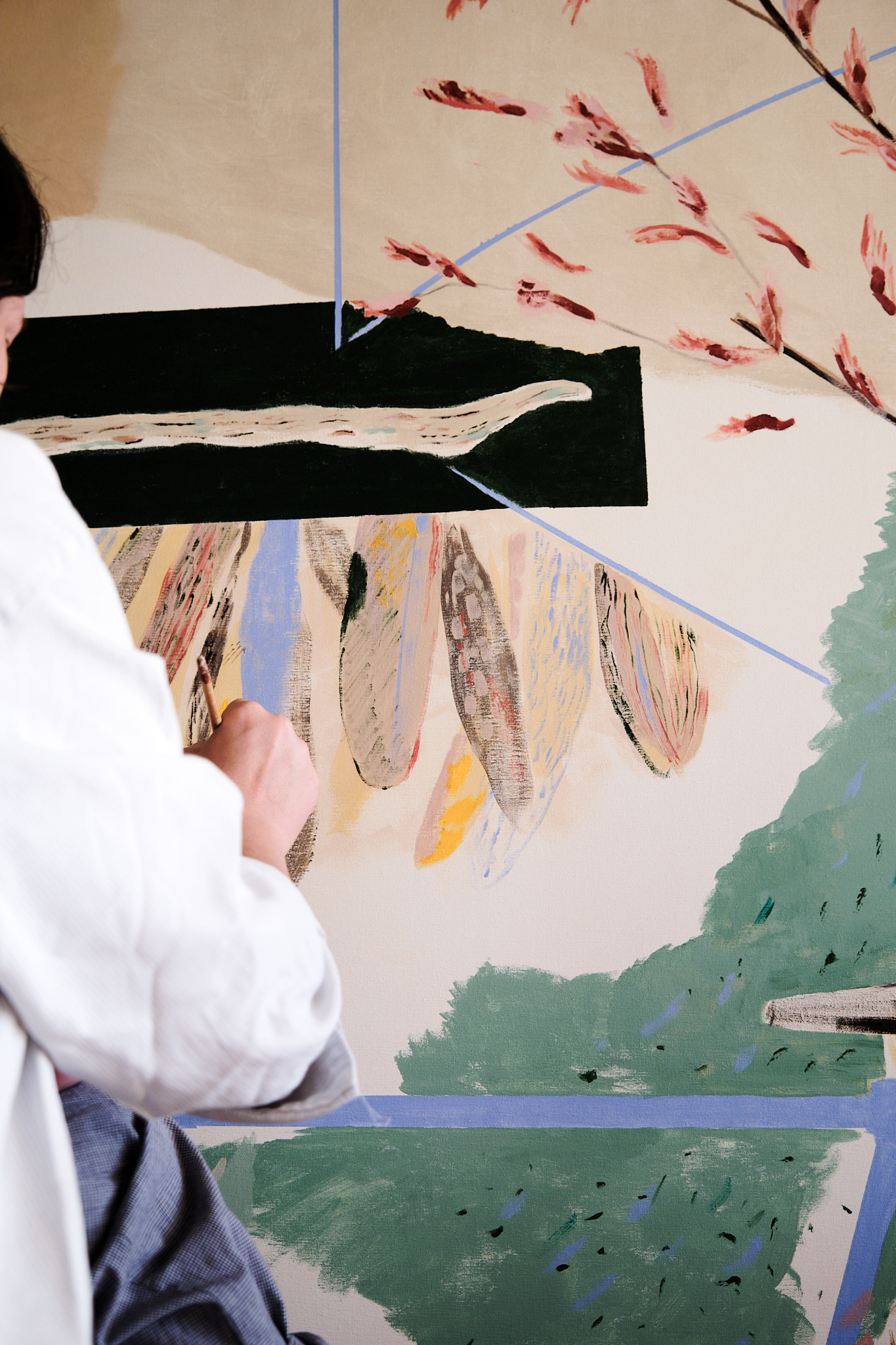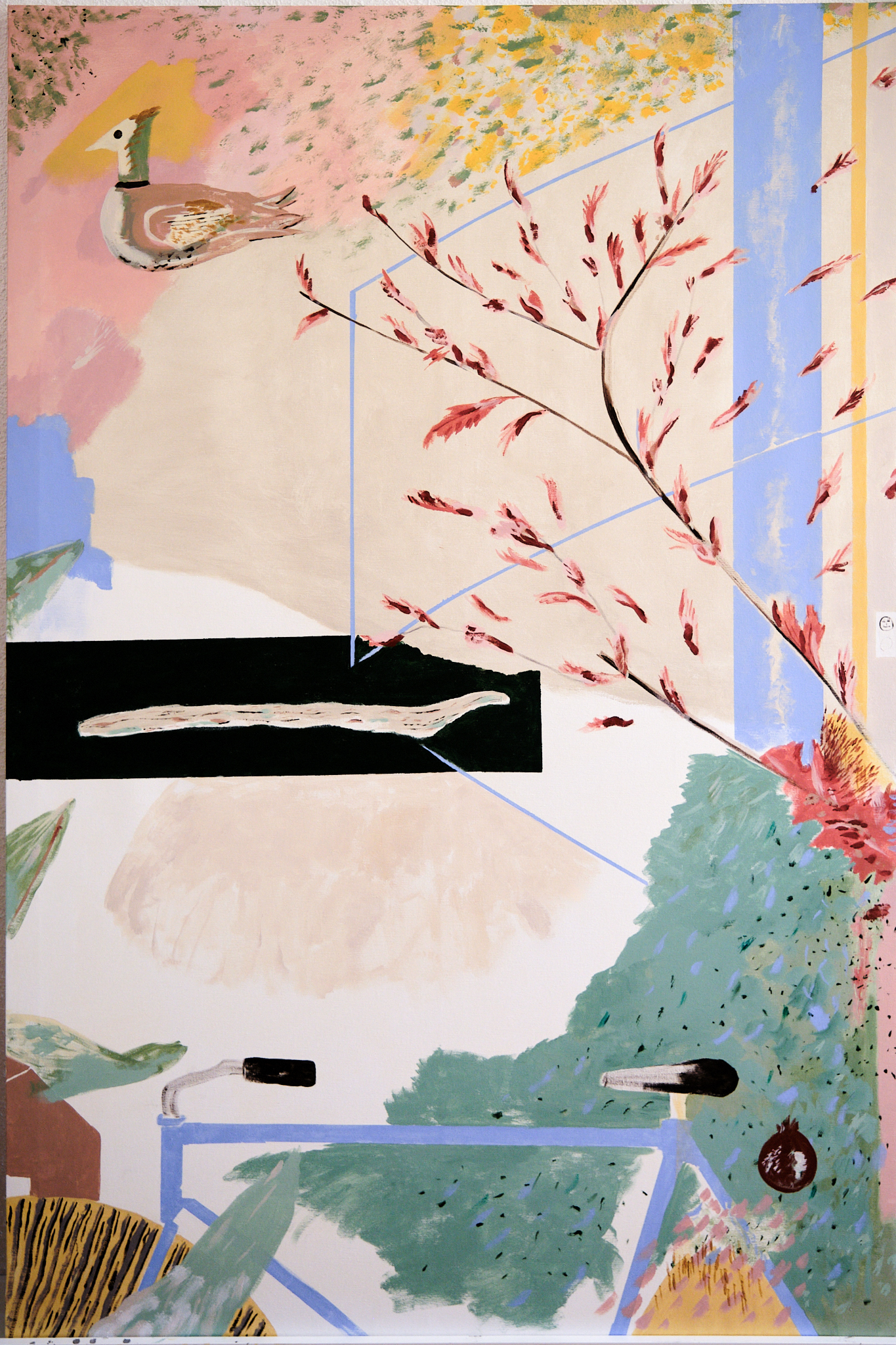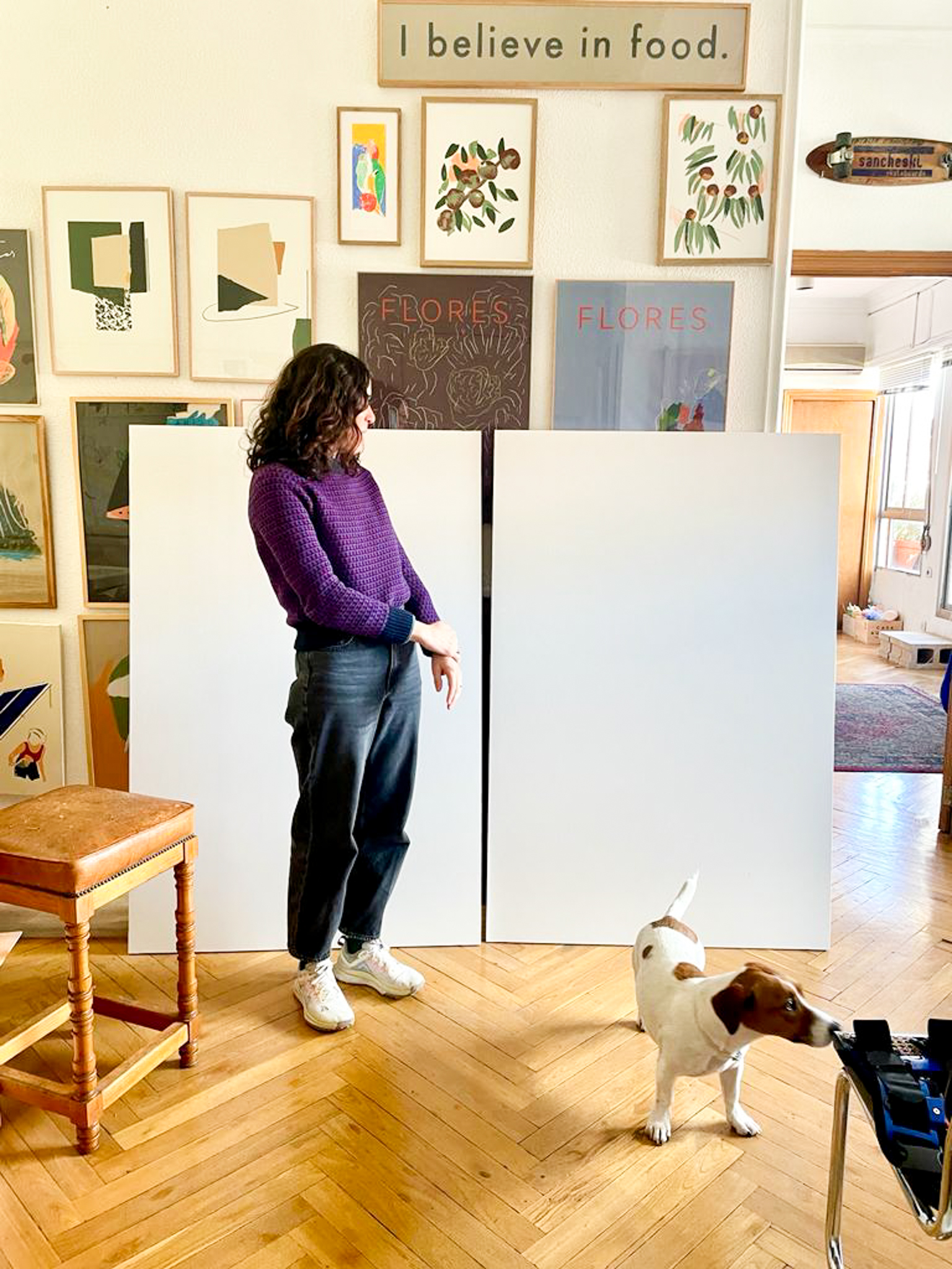 RetratoS ha vivido en Londres muchos años. Con su familia (P, C y E) y con Rubens, otro más. Ahora viven en Madrid pero tienen una casa, proyectada por Estudio Reciente en El Escorial. Con una escalera de caracol azul. Como punto de partida la mermelada de ciruelas claudias de la abuela, de la que parte este encargo, el chorizo de León, la fruta, los helados de Cadaqués, el fish & chips que les recuerda a antes de la pandemia, su plato familiar de arroz y más cosas. Piedras, palos y casas que representan sus intereses simbólicos. El tutú de plumas y los dibujos de pájaros. La bicicleta. El arce.